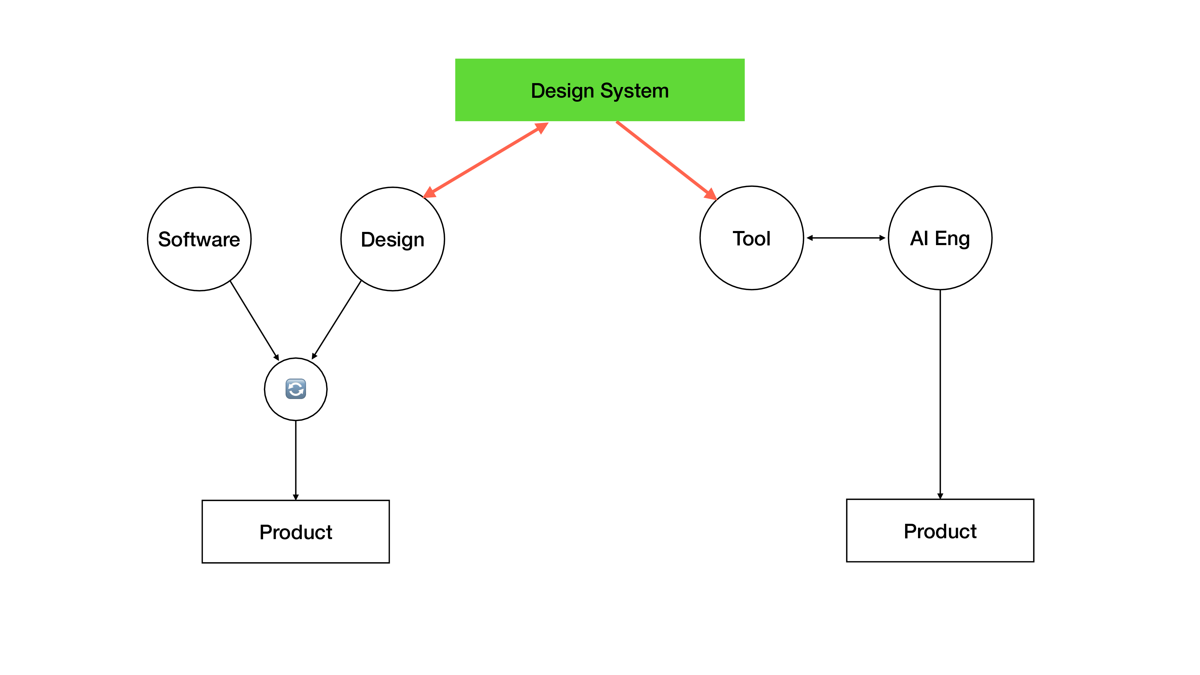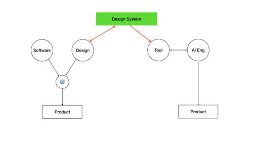 Now we see a cost. Adam’s is a read/write relationship and over here is a read-only relationship. Fine if one or two people do it, but in the inevitable tragedy of the commons, this is on the way to being out of date and redundant. Because all the juice that comes from the world, from the engagement with real problems, is getting diluted. Less feedback! As you can imagine, this [the design system] gets weaker, then this [the tool] gets weaker, then this [the product] gets weaker. Even though this person [the AI engineer] continued doing their best throughout.