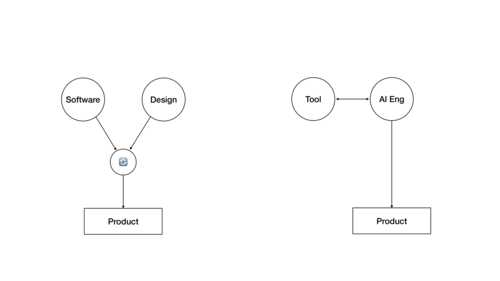 So over here on the left there’s me and there’s Adam, the lead designer. And here in the middle is the conversation we’re having. And the product comes out of the conversation, that co-design. And over here on the right is the “emerging reality”. Over here an AI Engineer interacts with a tool in a very fast feedback loop, and the product flows directly out of their fingertips.