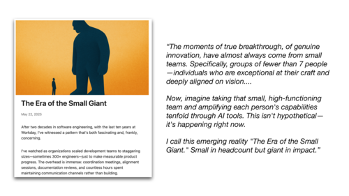 During my time at the Incubator we ran a lot of small teams. Some of them were very small—one or two people, usually AI Engineers. There was a blog post that was widely shared and often referred to around the organisation, especially amongst those smaller teams, but it had a lot of currency at management level too. It was called The Era of the Small Giant. The writer, who’s naturally the founder of an AI startup, writes about “reimagining what exceptional people can accomplish when unburdened by the friction of organizational mass”: